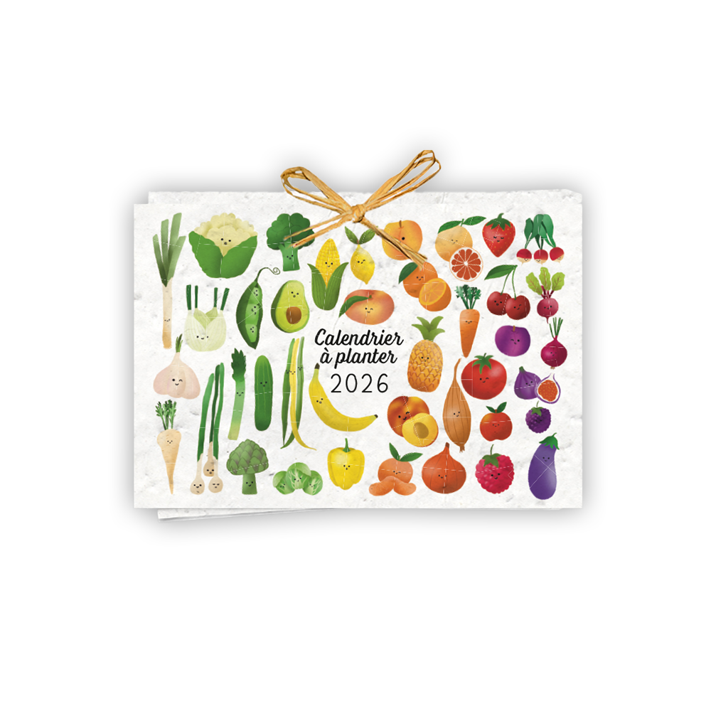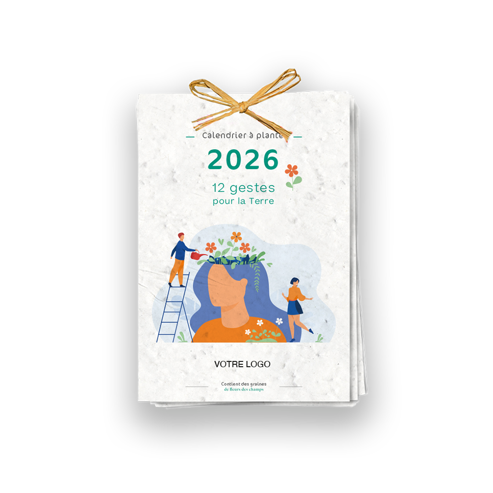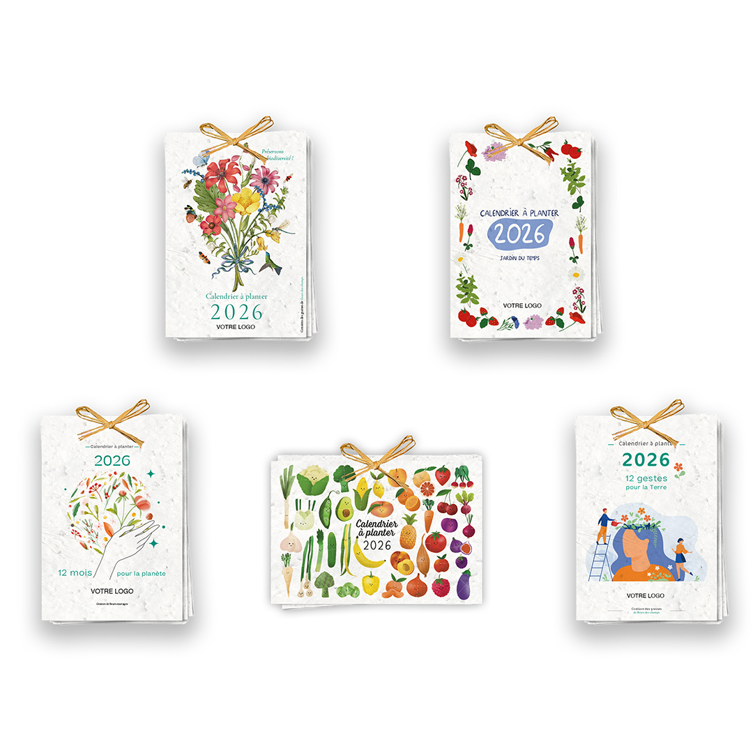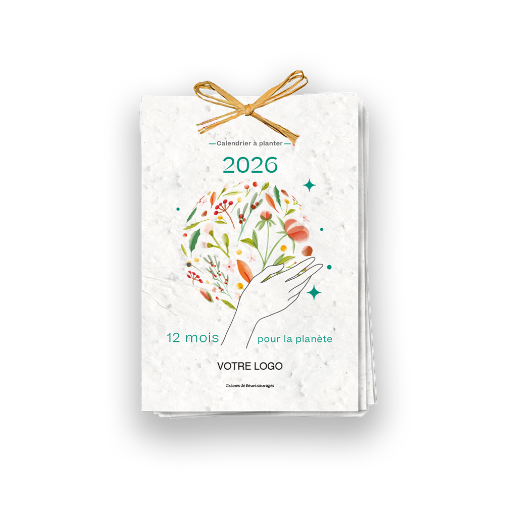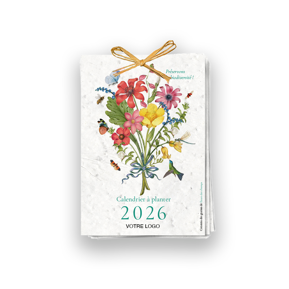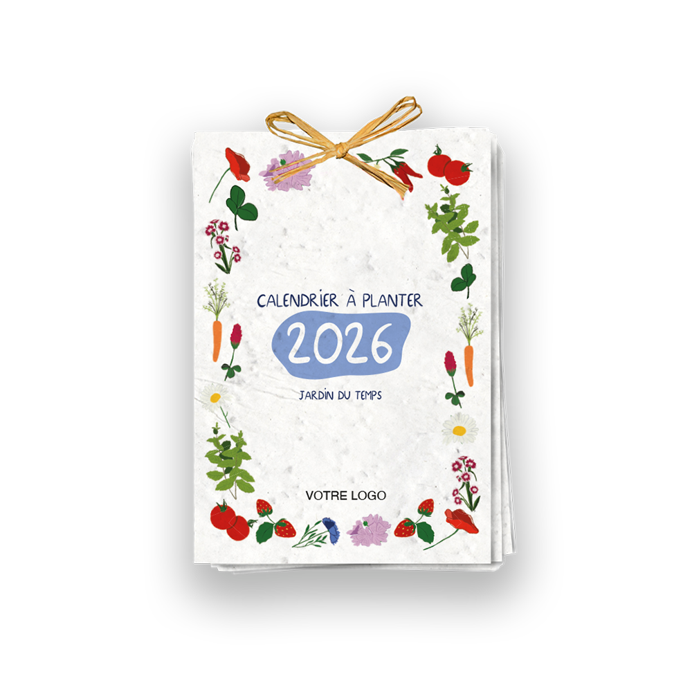 Un calendrier original et éco-responsable, idéal pour la rentrée ou pour célébrer la nouvelle année : personnalisez-le aux couleurs de votre entreprise et offrez-le à vos clients, collaborateurs ou partenaires. Ce calendrier à planter personnalisable est composé de 13 feuilles ensemencées à planter mois après mois, chaque feuillet est ensemencé de graines différentes : Menthe, Piment, Trèfle, Coquelicot, Fraise, Marguerite, Basilic, Tomate cerise, Mauve musquée, Carotte, Bleuet, Œillet de poète… Au fil des mois, agissons en faveur de l’environnement ! L’ensemble des feuillets du calendrier à planter est relié par du raphia naturel. Découvrez nos visuels personnalisables avec votre logo, vous pouvez aussi personnaliser toutes les pages avec vos créations.